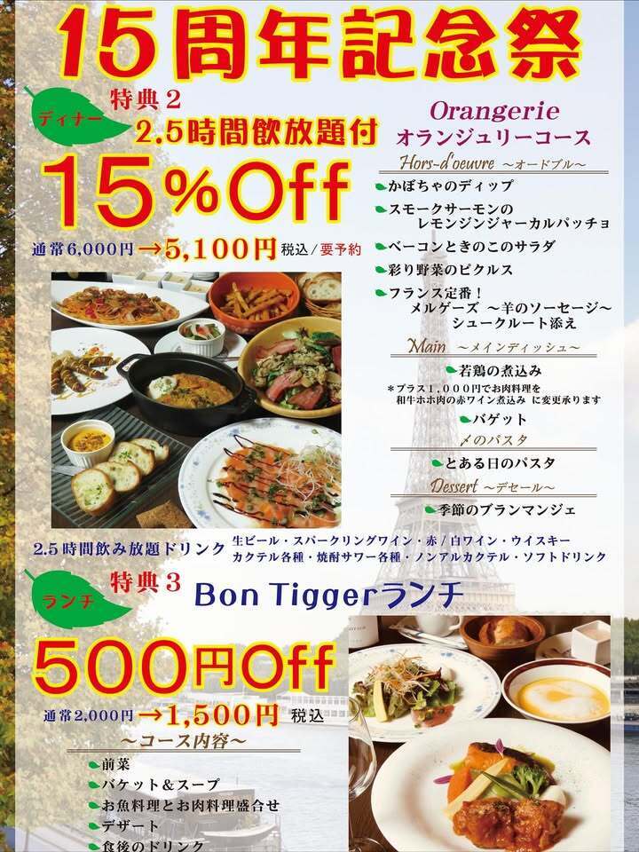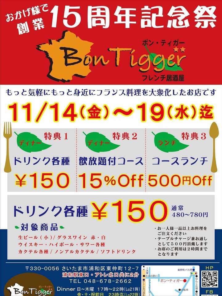 #フレンチ居酒屋ボンティガー #ボンティガー #15周年 #ドリンク150円 #感謝祭 #浦和駅東口 #PARCOそば #浦和フレンチ #浦和ビストロ #浦和ランチ #浦和ディナー #破格